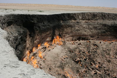 トルクメニスタンのカラクム砂漠の中央にあるガスクレーターである。ガスでできた空洞が陥没してできたクレーターといわれている。3か所あり、2か所は道路に面したところにある。水たまりがありそこからガスが出ているのがわかる。地獄の扉は道路から外れること約7キロ先にある。ここはガスが大量に出ているため、あえて火をつけたといわれている。熱風が襲ってきていた。